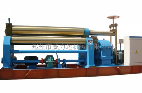 該機為對稱式三輥卷板機,兩下輥為主動固定輥,上輥通過升降絲桿、渦輪、蝸桿在兩下輥對稱中央作上下移動,兩下輥的左、右旋轉和上輥的升降移動均靠電機帶動減速器來完成,并能借助手動離合器把上輥調節成平行或傾斜位置,以適應卷制圓形和錐形工件的需要,渦輪上下配有特種壓力軸承,轉動輕松、省電耐磨。該機集機身、傳動、電器部分為一整體,其結構緊湊、操作方便、便于搬運、安裝和維護。
